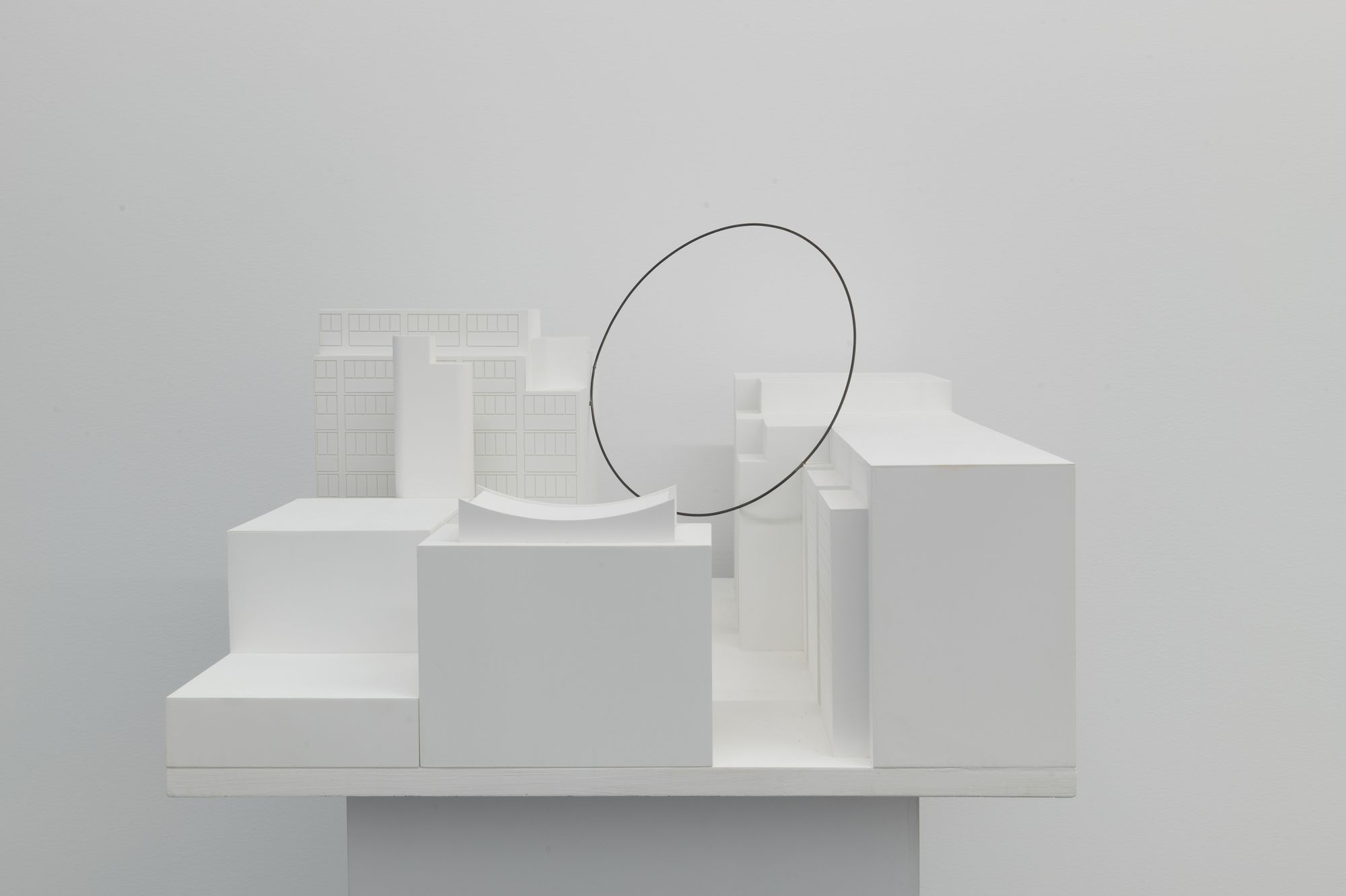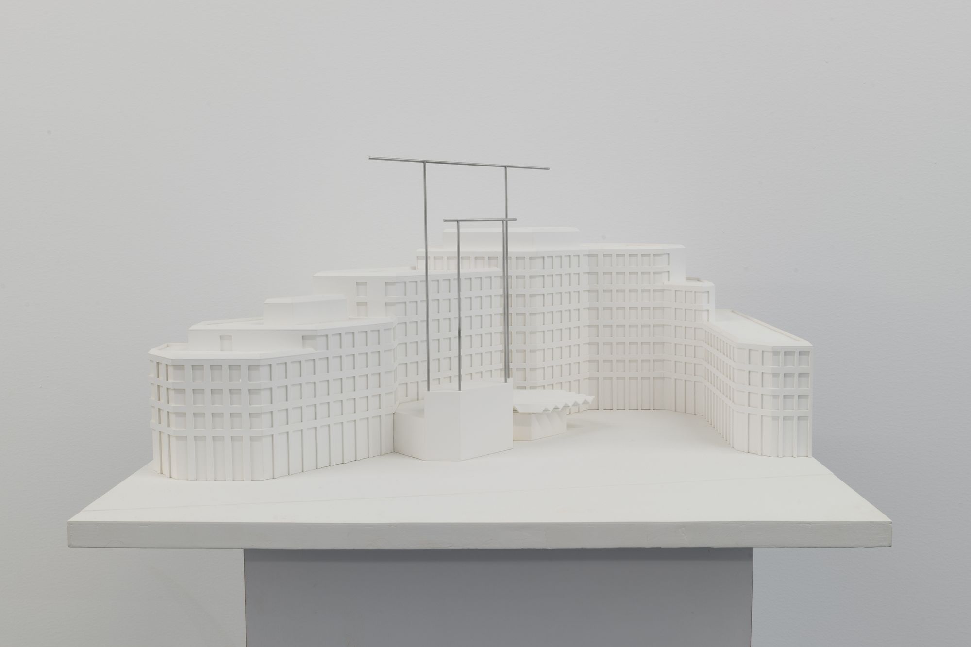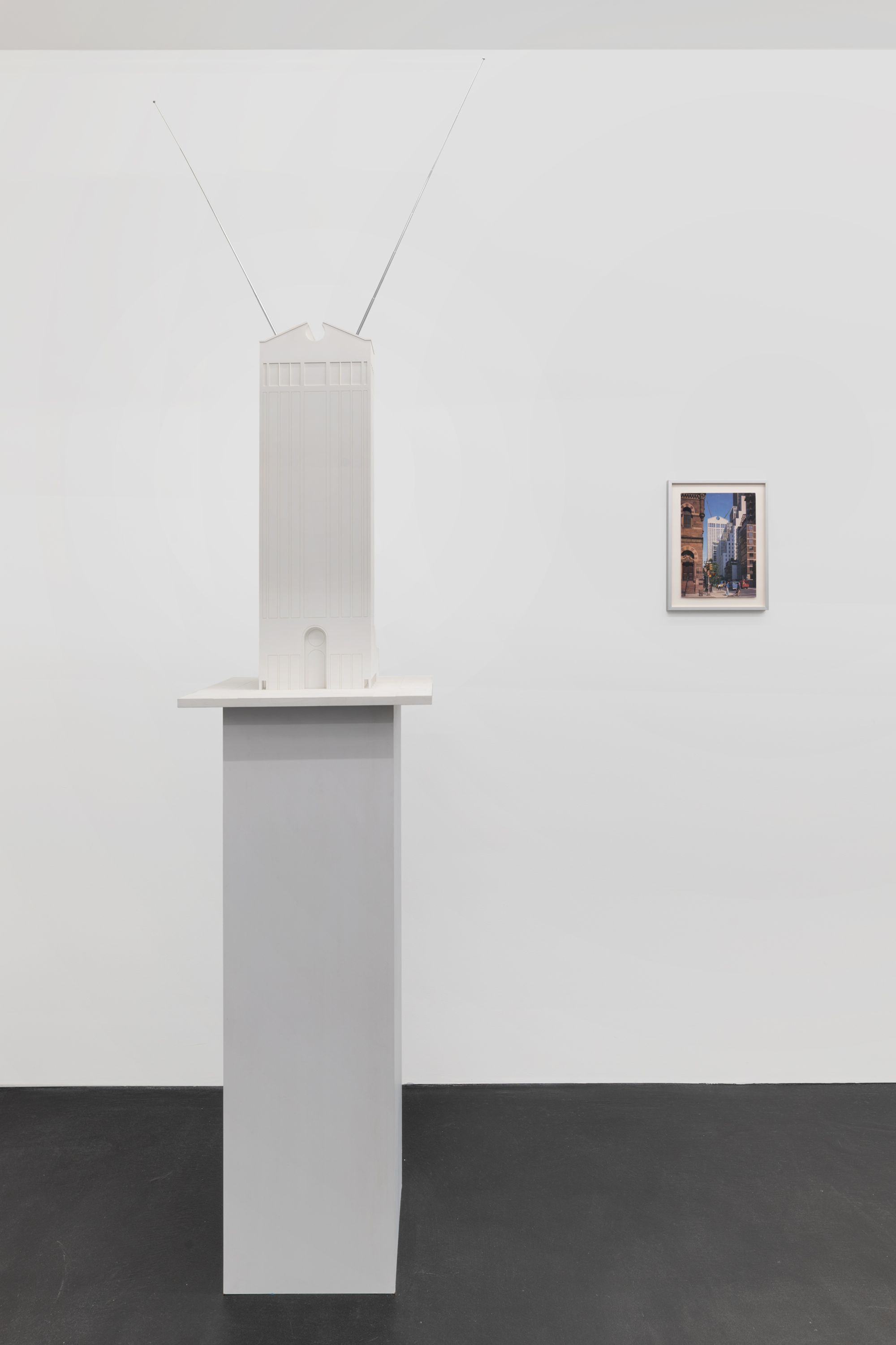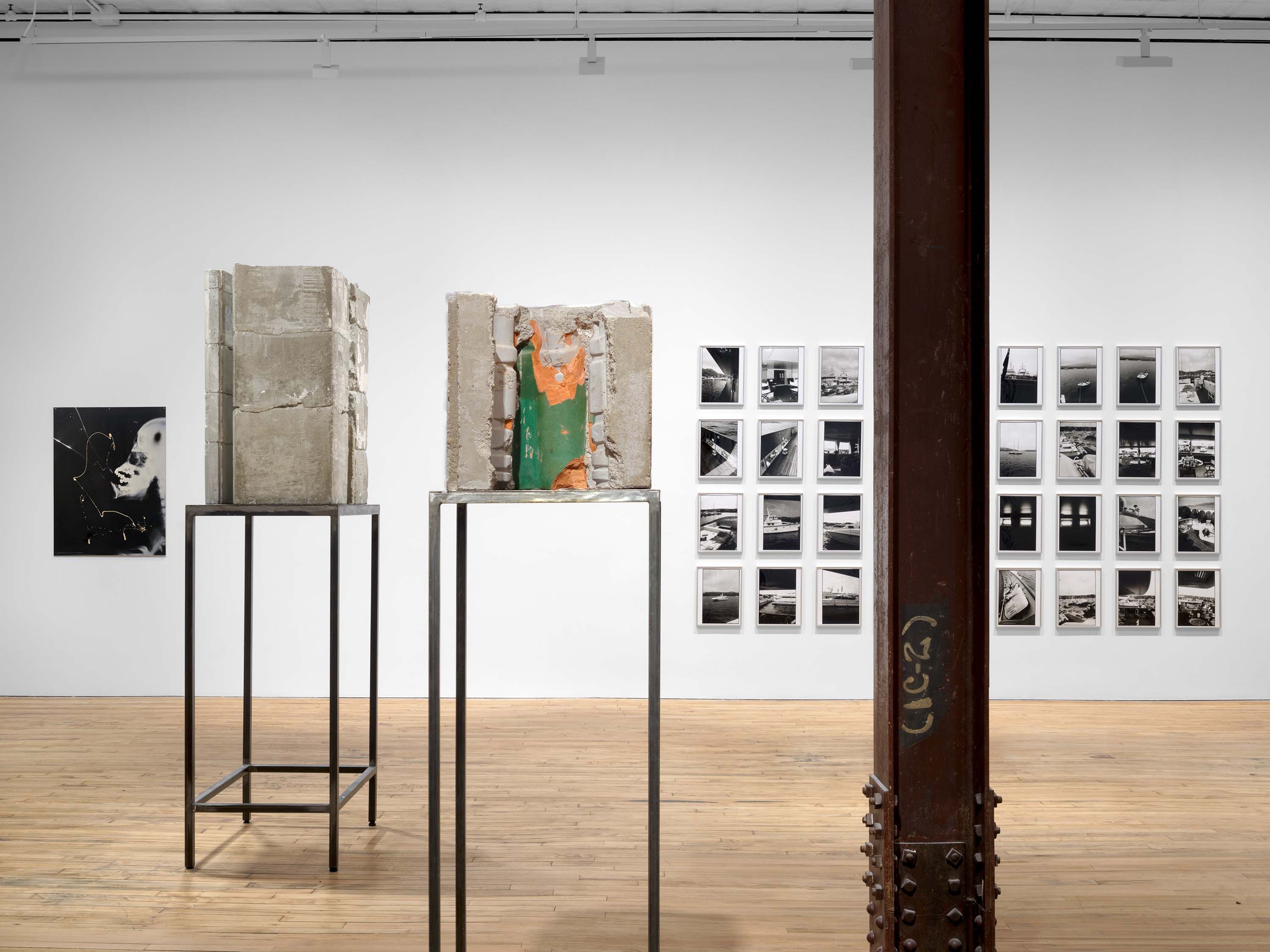 Installation view of Isa Genzken: Projects for Outside: ISA USA, Galerie Buchholz, New York, 2026. Isa Genzken, Modell für eine Gartenskulptur, 1986 (foreground). Concrete on concrete plinth; plinth: 55.3 × 17.5 × 16.1 in.; concrete: 16.5 × 15 × 12.6 in.; combined: 71.9 × 17.5 × 15.7 in. Isa Genzken, Untitled, 1985 (back right). Ink on grid paper; 11.4 × 8.3 in. (framed: 16.2 × 12.8 × 1.1 in.); Isa Genzken, Untitled (Gartenskulptur), 1986 (back left). Photo-collage mounted to card; 8.3 × 11.7 in. Courtesy of Galerie Bucholz.