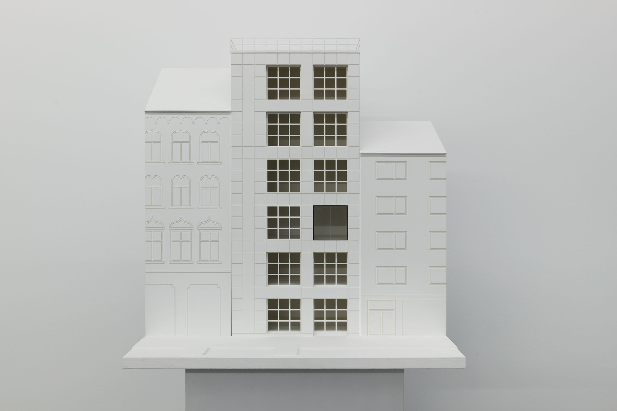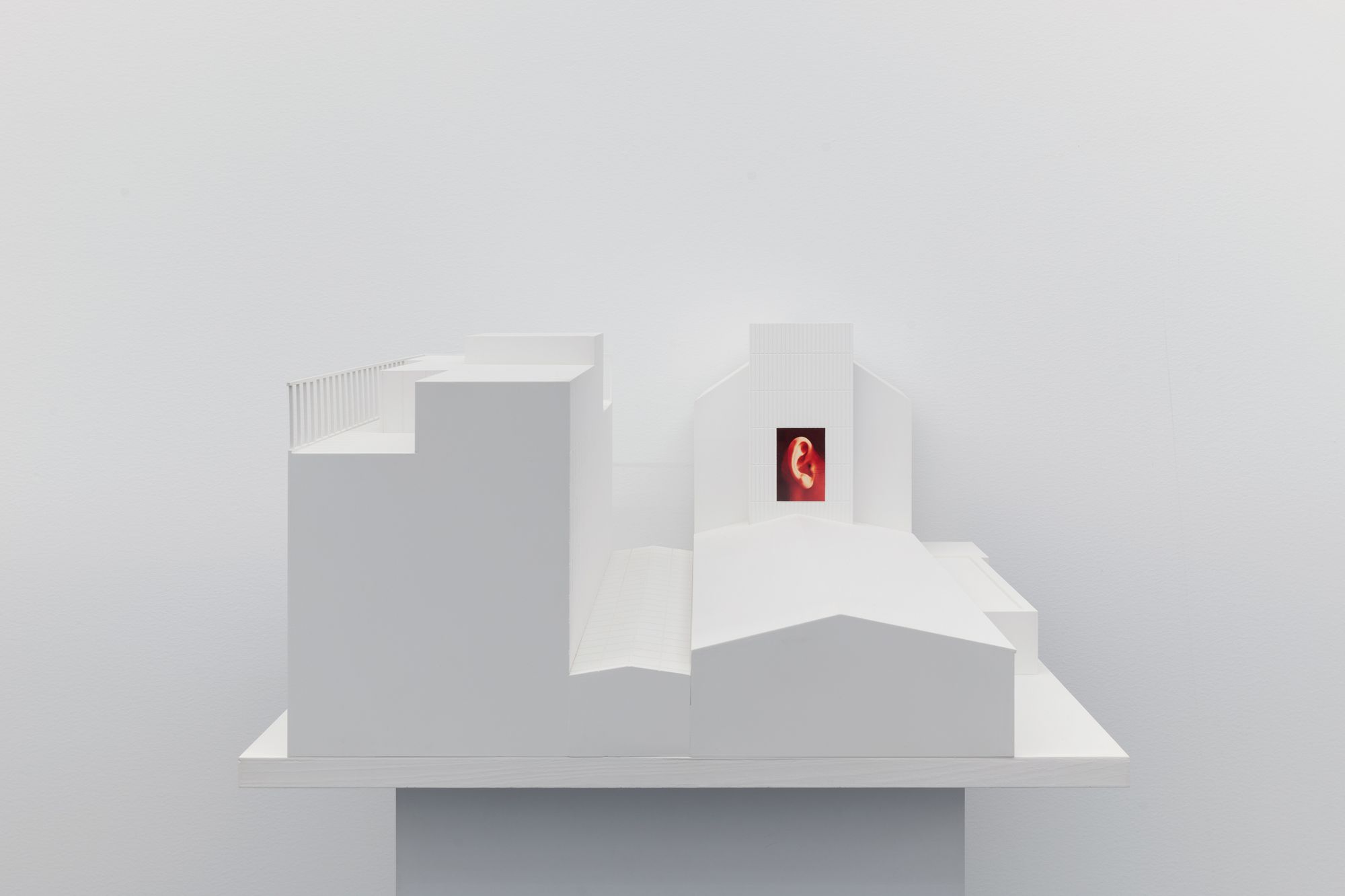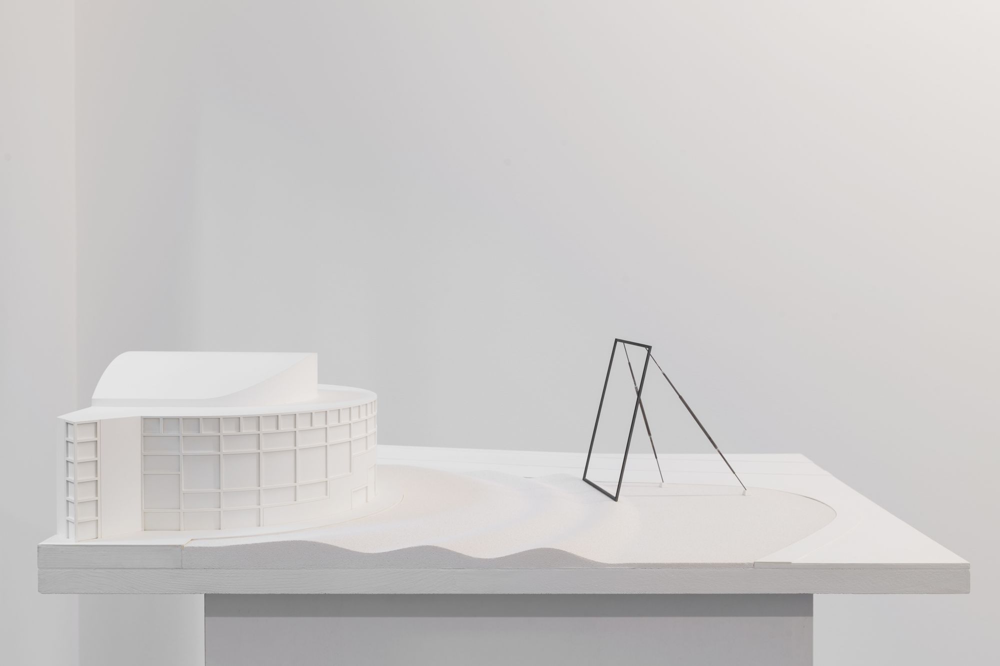 Installation view of Isa Genzken: Projects for Outside: ISA USA, Galerie Buchholz, New York, 2026. Isa Genzken, Modell für eine Gartenskulptur, 1986 (foreground). Concrete on concrete plinth; plinth: 55.3 × 17.5 × 16.1 in.; concrete: 16.5 × 15 × 12.6 in.; combined: 71.9 × 17.5 × 15.7 in. Isa Genzken, Untitled, 1985 (back right). Ink on grid paper; 11.4 × 8.3 in. (framed: 16.2 × 12.8 × 1.1 in.); Isa Genzken, Untitled (Gartenskulptur), 1986 (back left). Photo-collage mounted to card; 8.3 × 11.7 in. Courtesy of Galerie Bucholz.