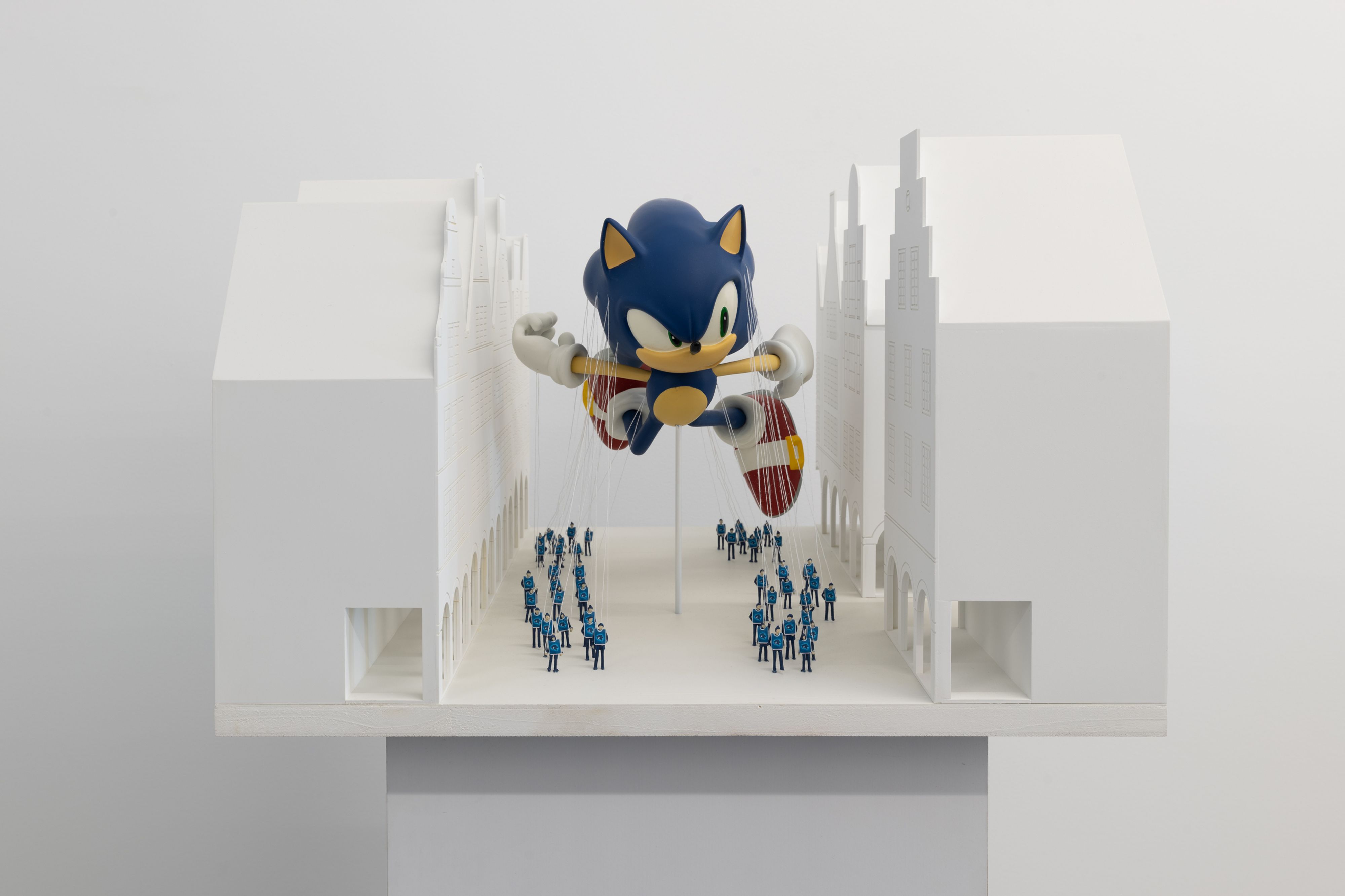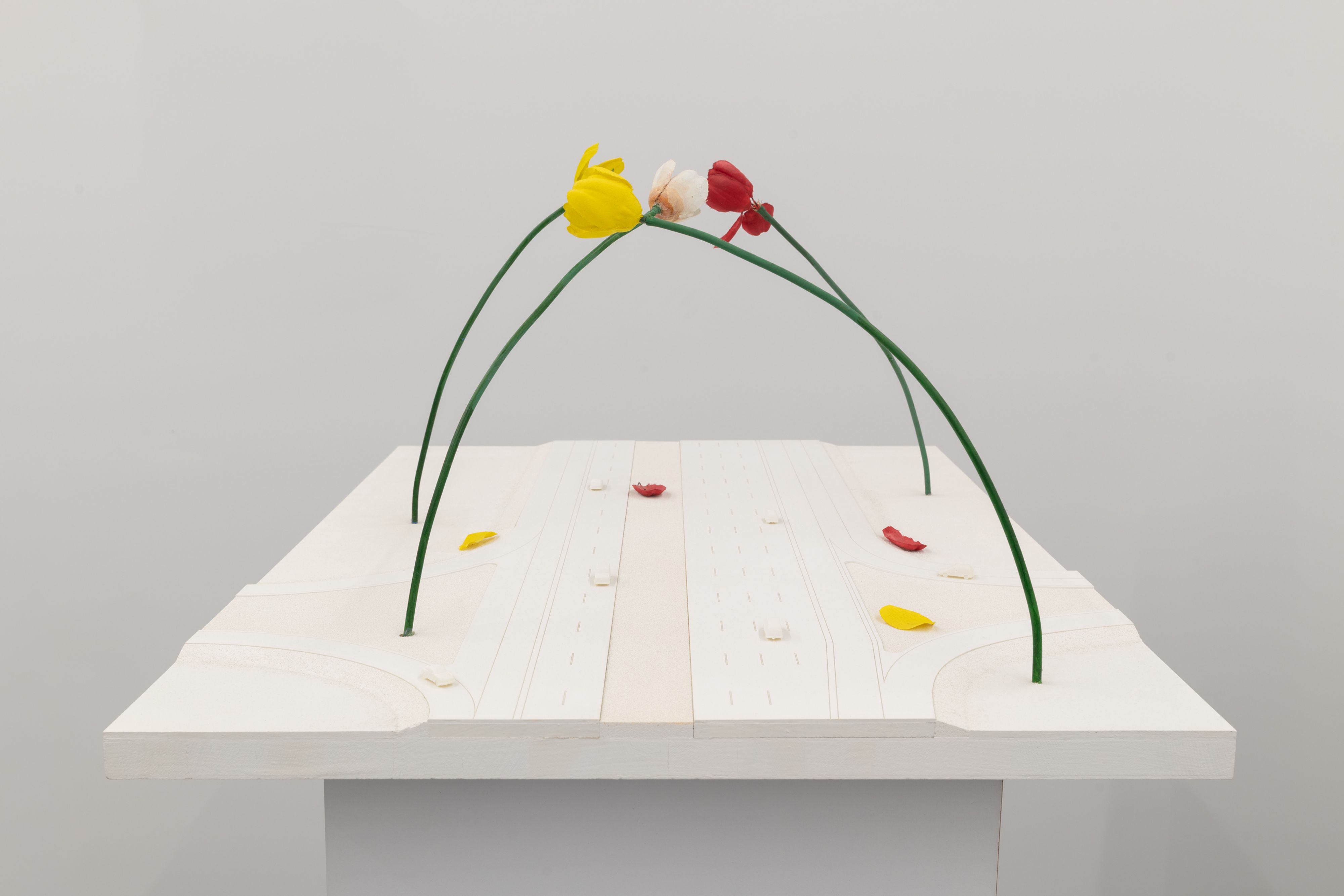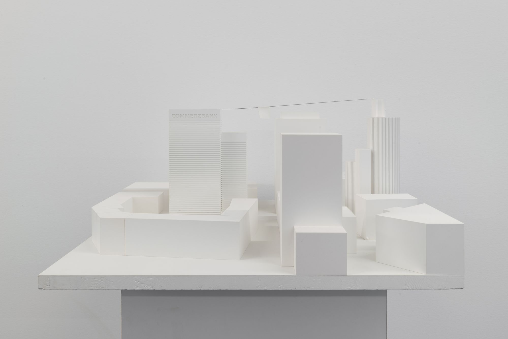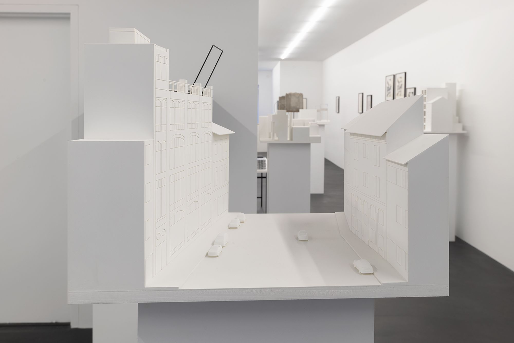 Installation view of Isa Genzken: Projects for Outside: ISA USA, Galerie Buchholz, New York, 2026. Isa Genzken, Modell für eine Gartenskulptur, 1986 (foreground). Concrete on concrete plinth; plinth: 55.3 × 17.5 × 16.1 in.; concrete: 16.5 × 15 × 12.6 in.; combined: 71.9 × 17.5 × 15.7 in. Isa Genzken, Untitled, 1985 (back right). Ink on grid paper; 11.4 × 8.3 in. (framed: 16.2 × 12.8 × 1.1 in.); Isa Genzken, Untitled (Gartenskulptur), 1986 (back left). Photo-collage mounted to card; 8.3 × 11.7 in. Courtesy of Galerie Bucholz.