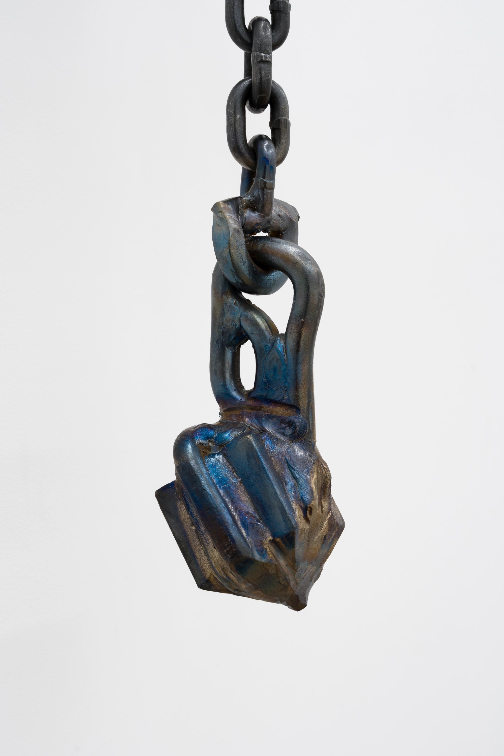 Davis discovered the exhibition’s namesake — Cam’ron’s Confessions of Fire — as a six-year-old growing up in the Bronx. He pictured a future self that looked like its cover art, dressed in leather overalls, swinging around a big hammer at a mill somewhere. A version of that vision has been realized at King’s Leap. Although this work foregrounds steel, leather is Davis’s most consistent medium. It’s featured in his video work, in the form of costume, and comprises early sculptures like 2021’s White American Flag. The artist wore leather by necessity as he forged, embossed, and Frankensteined the works in Confessions of Fire. They take the forms of cages, safes, or machines (Remy); padlocks and chains (Gay Secrets); sometimes a phallus, others a hole (Paul and Michael).