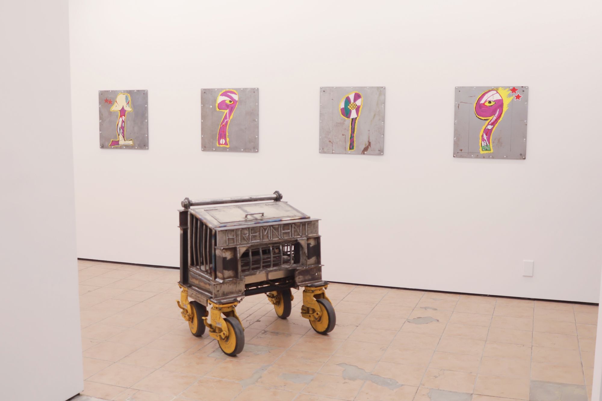 Isaiah Davis’s solo exhibition, Confessions of Fire, is about many things: music, film, slang, sex, class, and the image of the Black artist. But at its core, he says, “it’s a show about steel — about how the steel came to be.” You might also say it’s about how a boy comes to be a man. The works staged at King’s Leap on Henry Street (mostly sculptures, free-standing or wall-mounted, plus four painted signs) reference the artist’s youth pop culture superheroes: Cam’ron, whose 1988 debut inspired the show’s title, and Prince, Michael Jackson, James Brown, Ving Rhames, among others.