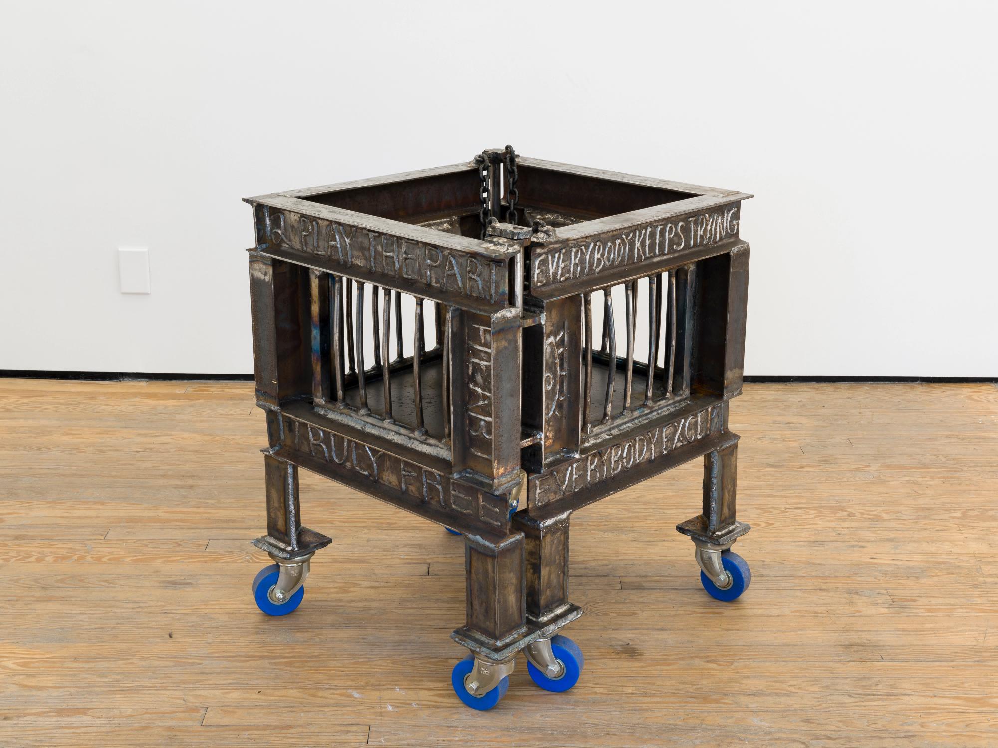 Isaiah Davis, Slave, 2025; steel. 35 x 21 x 28 in. Image courtesy of the artist and King's Leap. Photo by Stephen Faught.
