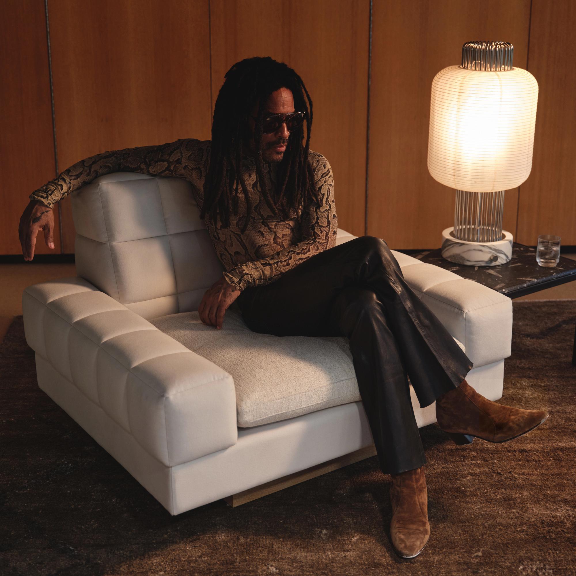 Lenny Kravitz lounges in his Kanan chair. On the Rohe side table: the Nagara table lamp with a white marble base.
