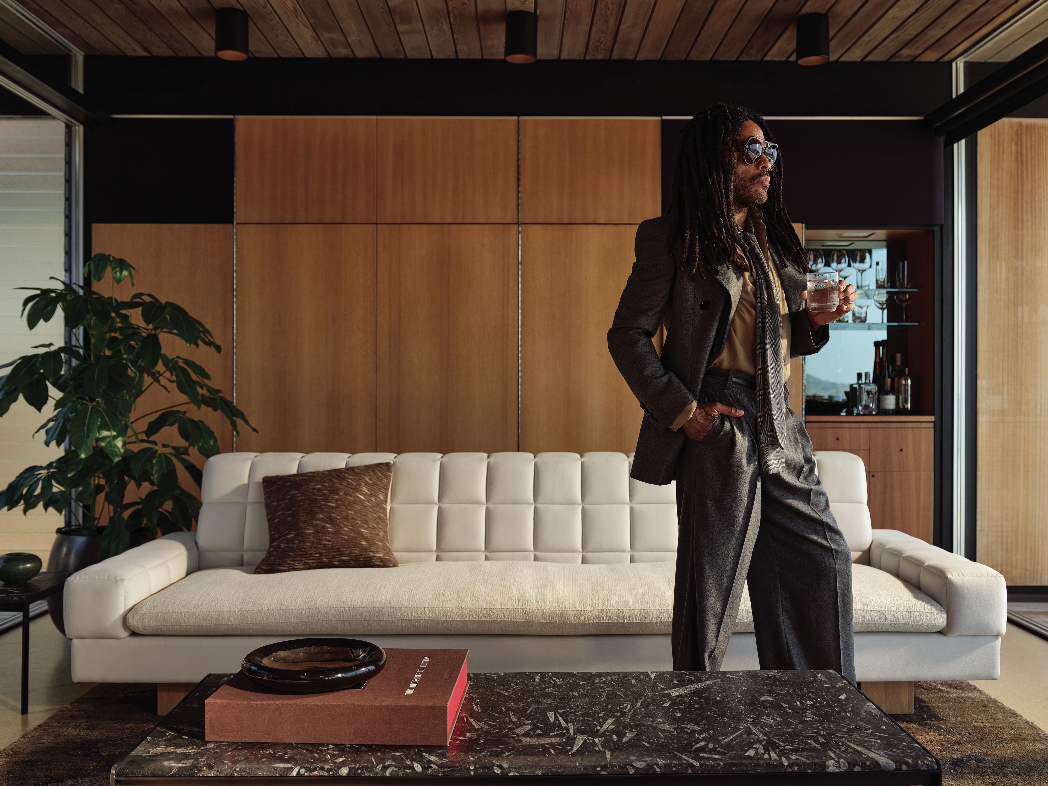 Lenny Kravitz photographed in a 1957 Craig Ellwood house in Malibu with his collection for CB2. Courtesy CB2.