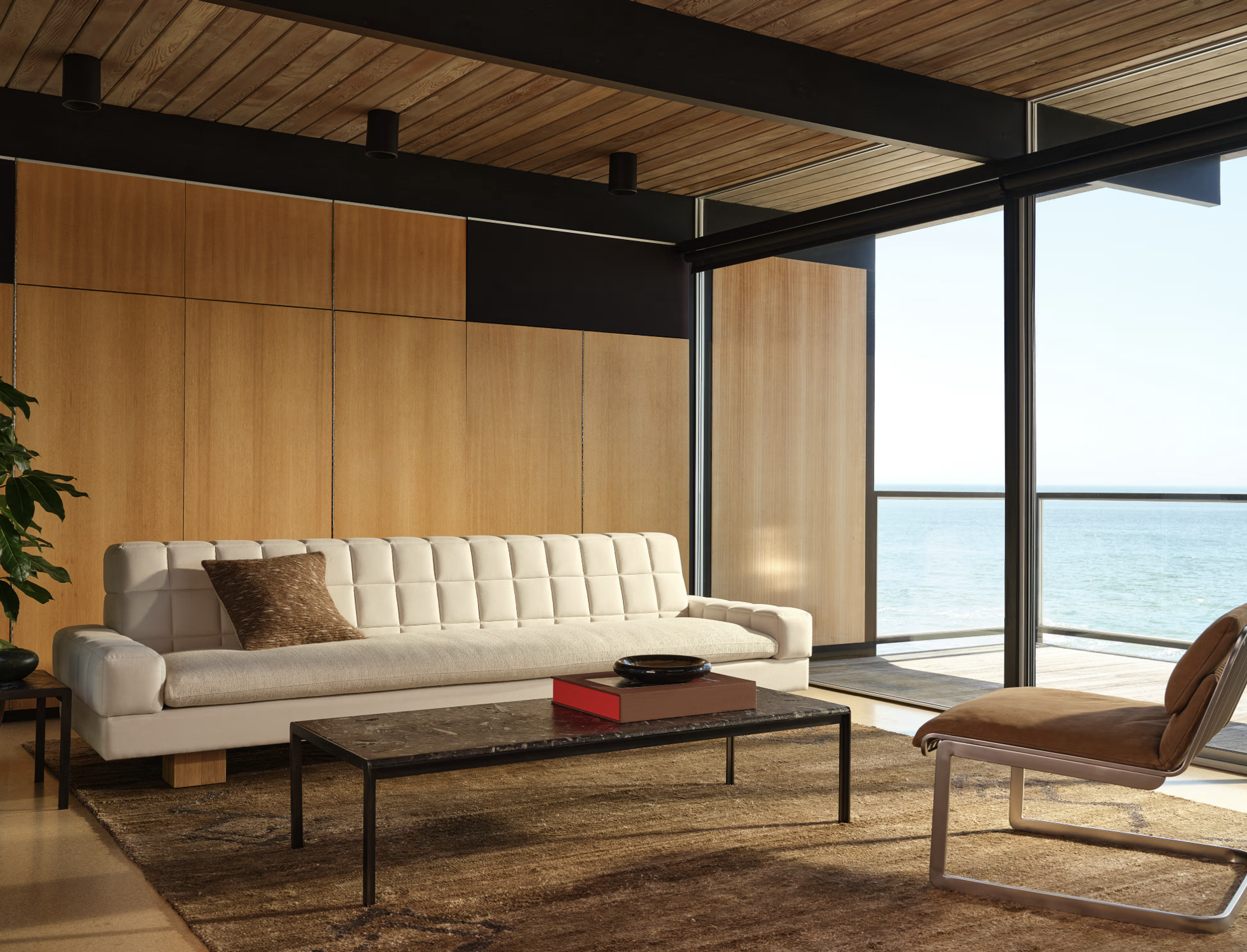 The crescendo of the CB2 collection is the Kanan sofa — a sleek, low-slung upholstered piece that channels Italian design sensibilities with deep dimensions and bold tufting. Sofas are a central pillar of Kravitz’s design philosophy, if not an obsession. “I have a couch fetish,” he demurs. “I don’t have enough rooms for all the couches I love.” The Kanan accomplishes that elusive balance that Kravitz is always searching for: “sleek, bold, and super comfortable with minimal lines.” The Kanan delivers exactly that: an object of pure ease that still carries the charge of Kravitzian performance.