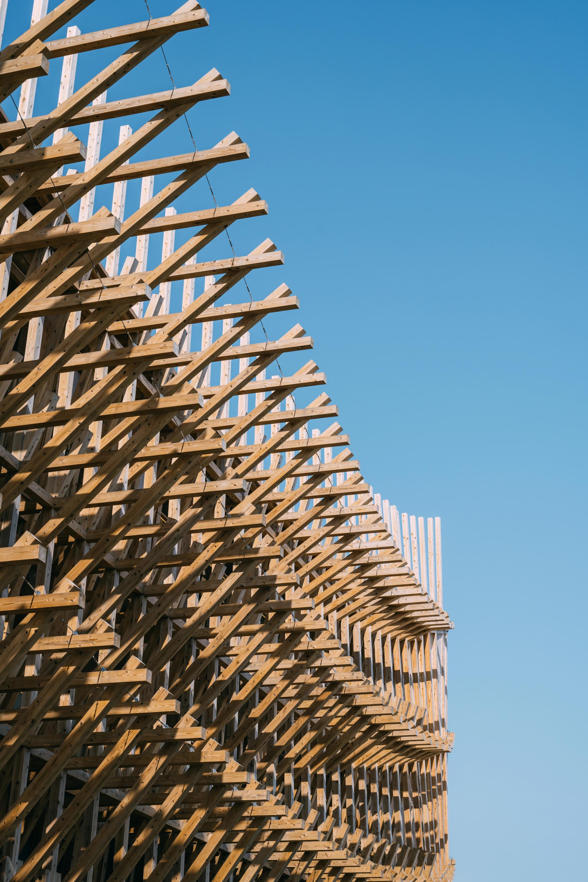 For the Bahrain Pavilion at the Osaka Expo 2025, Ghotmeh drew inspiration from traditional Bahraini dhow boats and Japanese wood artistry, designing a lightweight, fully reusable timber structure built from 3,000 pieces of unengineered wood held together through intricate joinery. Photography by Iwan Baan. Image courtesy Lina Ghotmeh — Architecture.