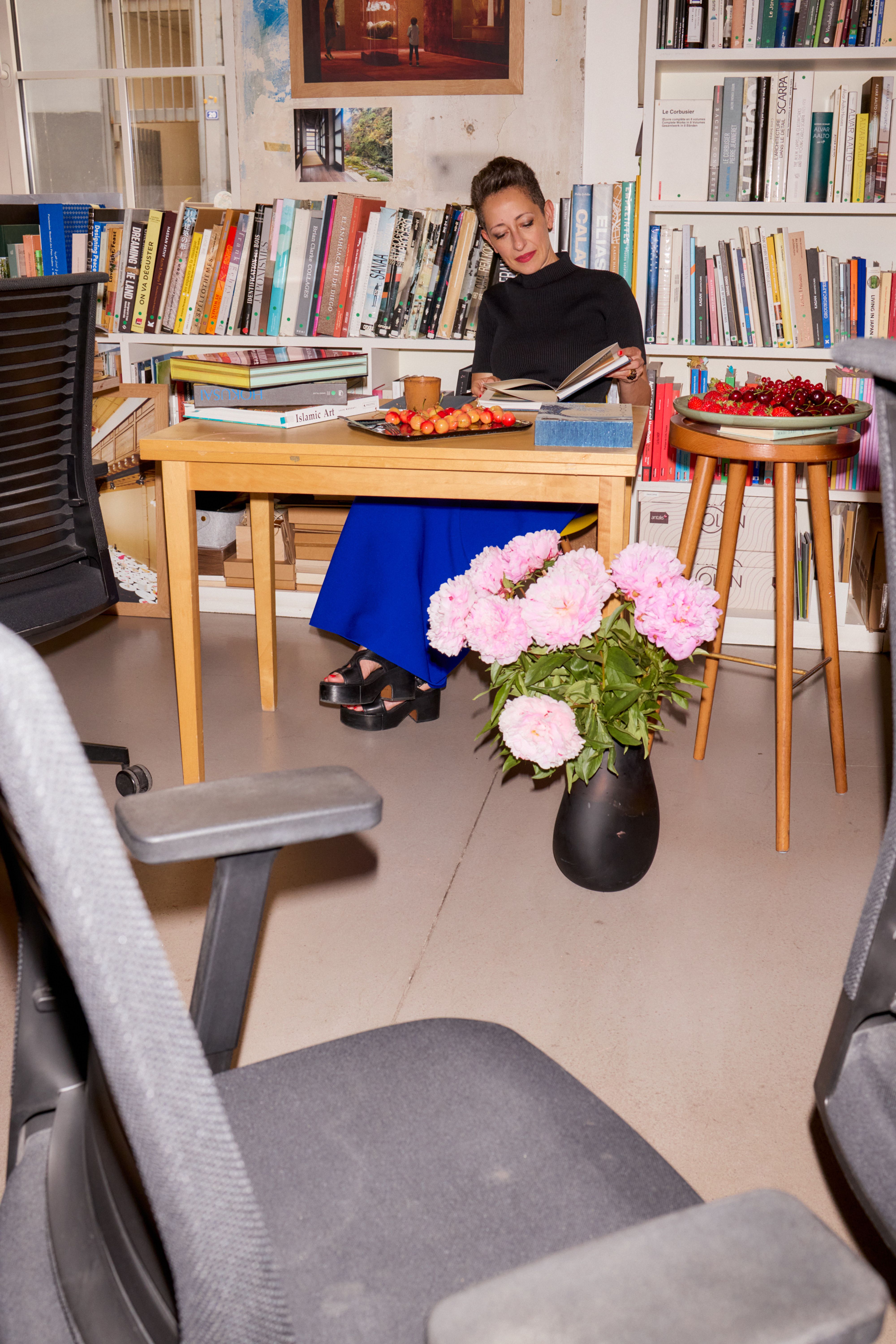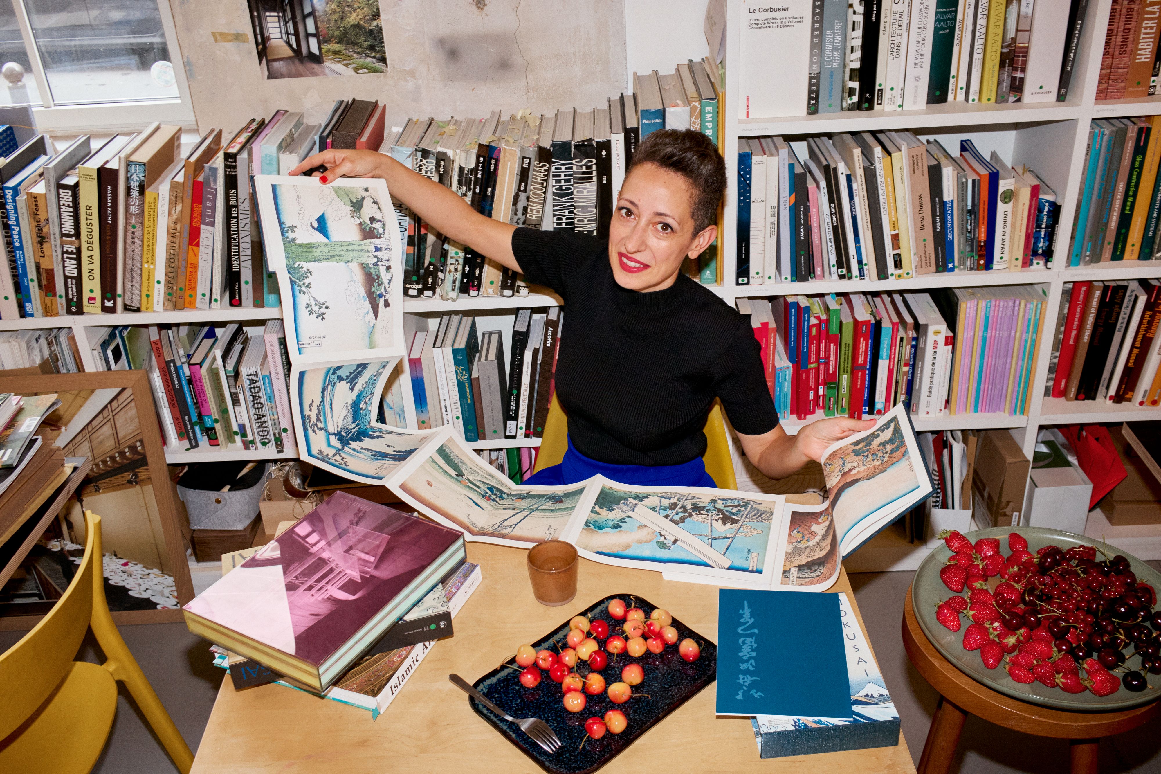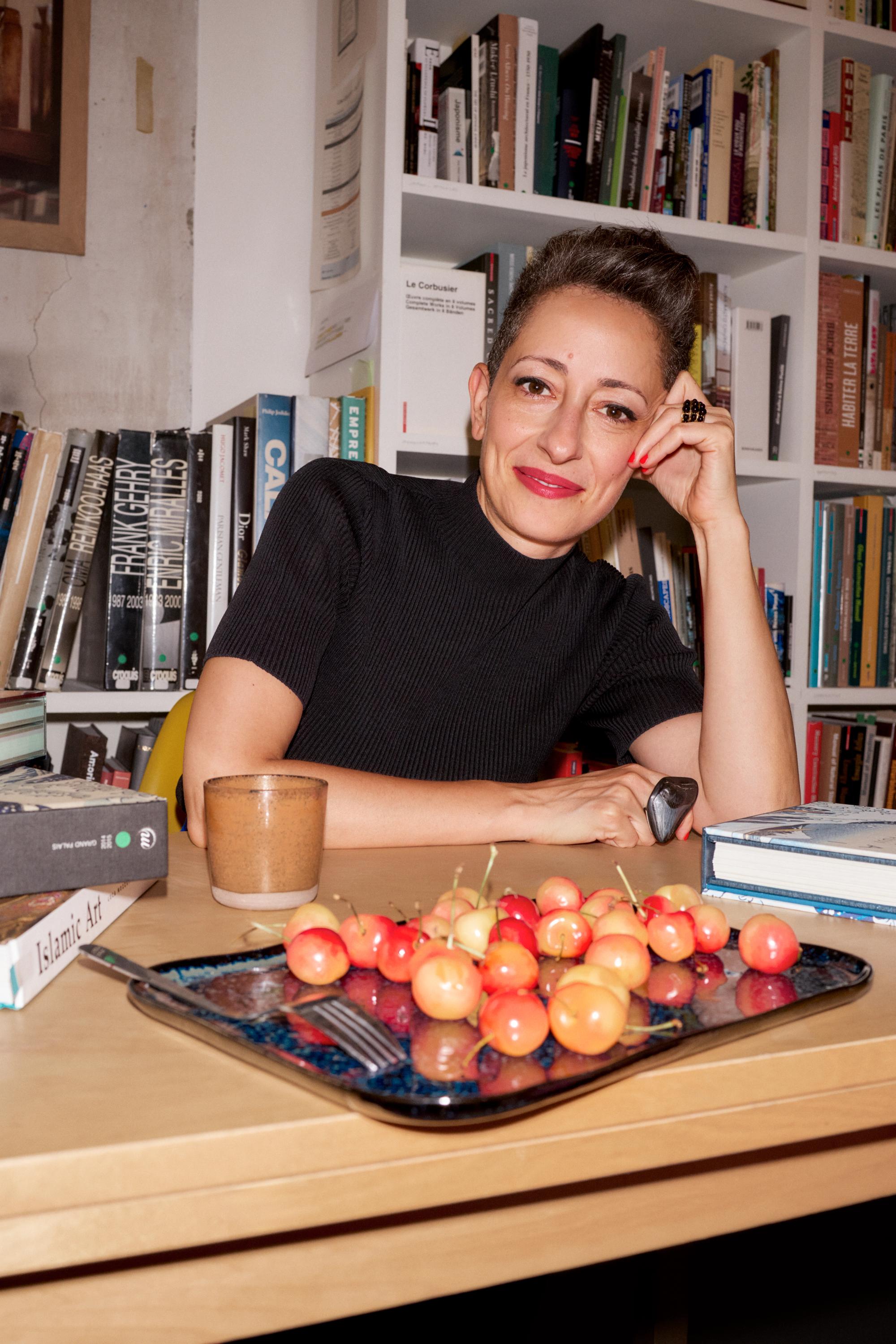 Lina Ghotmeh sitting at the desk in her 11th Arrondissement Paris office, where she spends most of her time. Portrait by Lars Brønseth for PIN–UP 39.