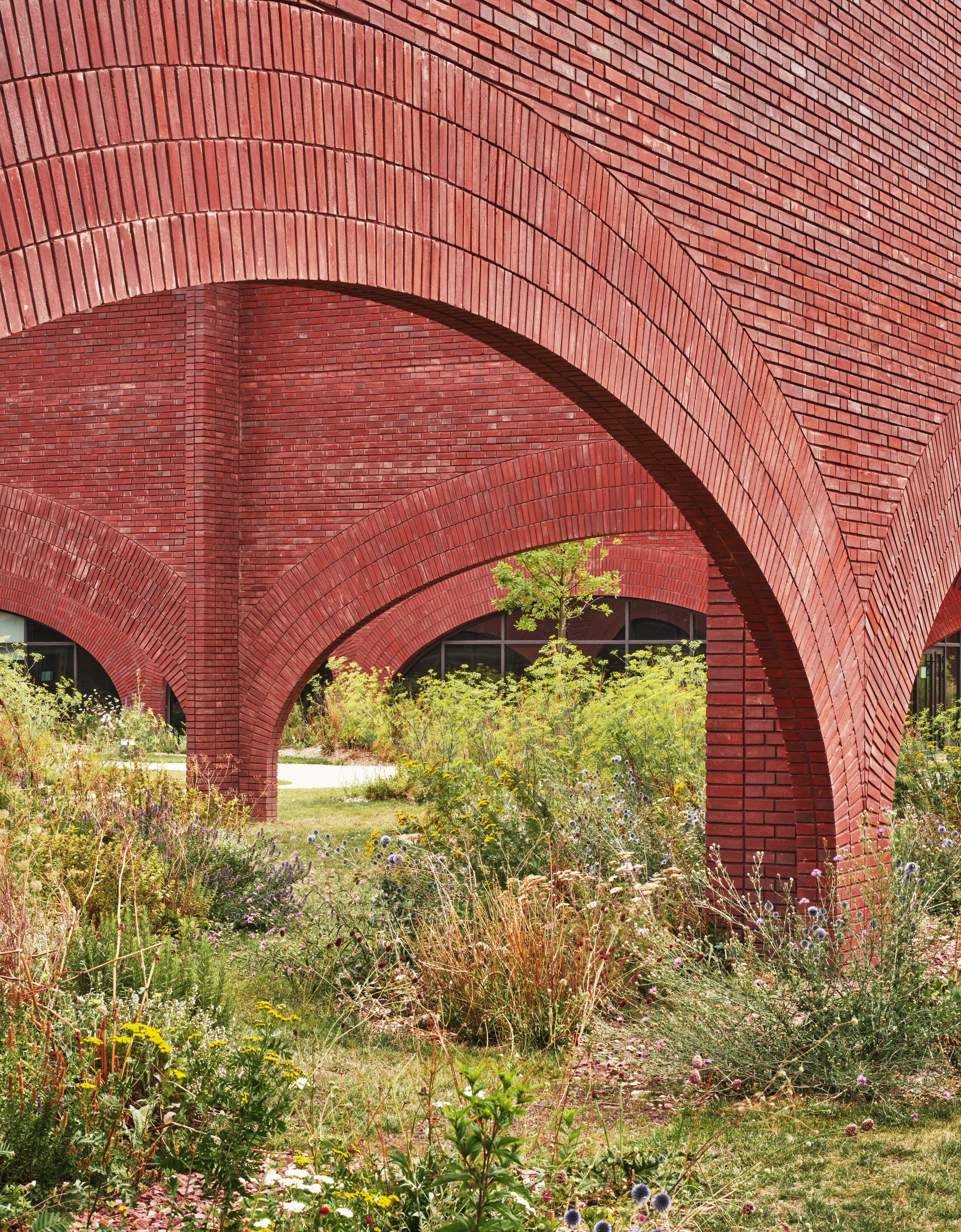 For the Hermès Workshops in Normandy, Ghotmeh designed France’s first passive, energy-positive, low-carbon industrial building. Sloping brick arches, inspired by the gallop of a horse, frame light-filled spaces for artisans at work, while the gestures of leather craftsmanship guide the building’s proportions and details. Photography by Takuji Shimmura. © Hermès. Image courtesy Lina Ghotmeh — Architecture.